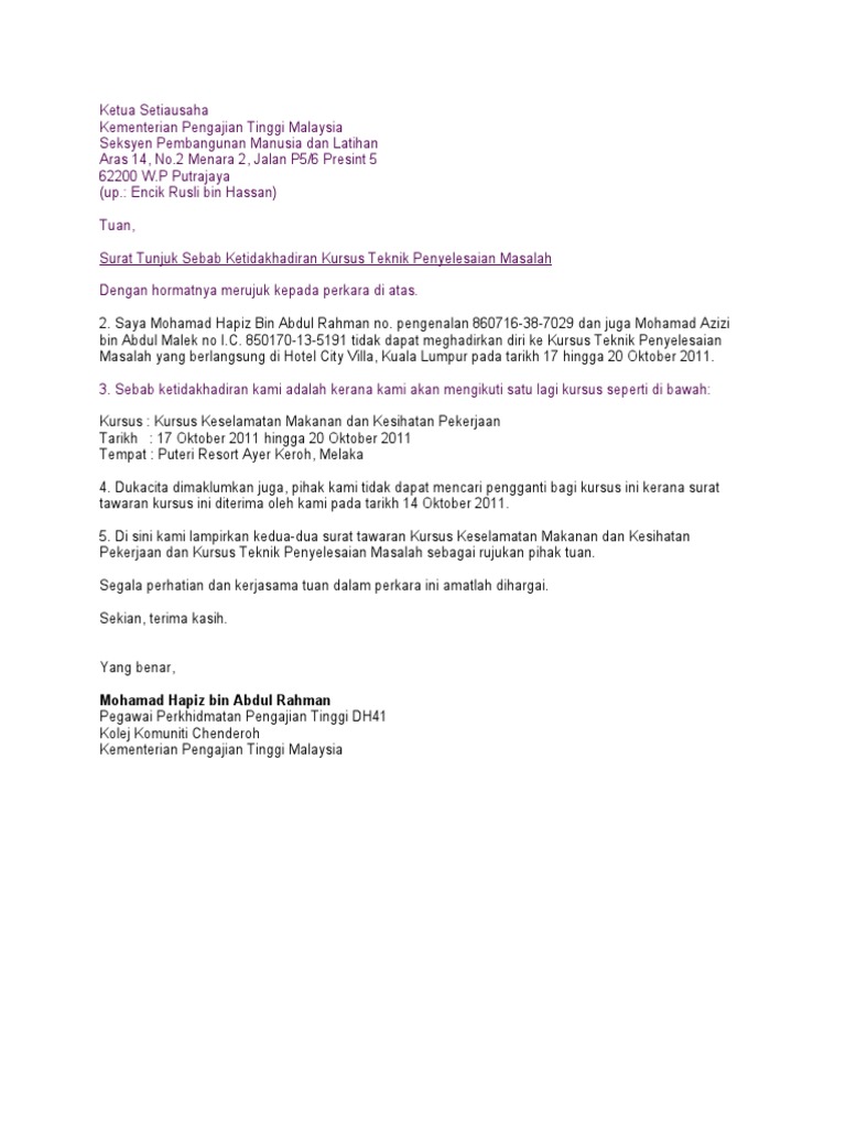 Surat Tunjuk Sebab Tidak Hadir Kursus Pdf